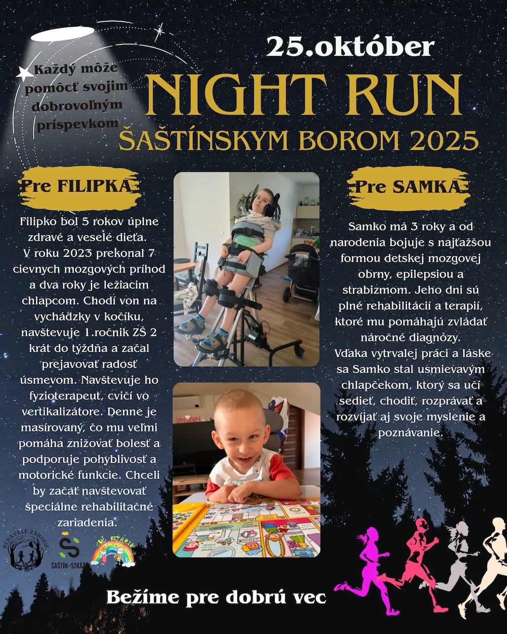 V Šaštíne-Strážach sa v sobotu 25. októbra uskutoční charitatívny Night Run Šaštínskym borom. Nočný beh s podtitulom „Bežíme pre dobrú vec“ ponúkne bežcom aj chodcom športový zážitok pod hviezdami a možnosť pomôcť deťom v ťažkej životnej situácii.