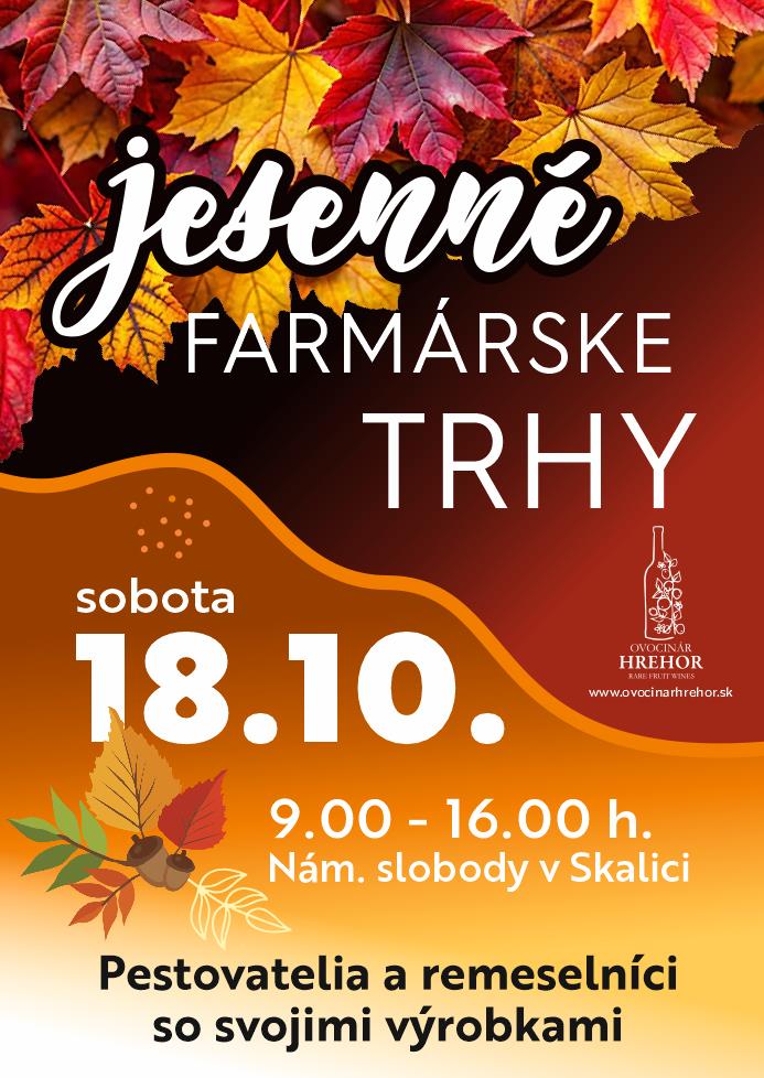 Na Námestí slobody v Skalici sa v sobotu 18. októbra od 9:00 do 16:00 uskutočnia tradičné Jesenné farmárske trhy. Cieľom podujatia je podporiť lokálnych výrobcov a priblížiť návštevníkom tradičné chute i remeslá.