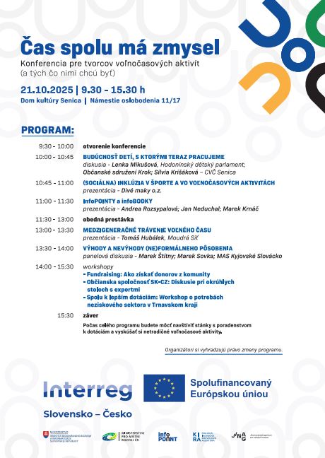 V meste Senica sa v utorok (21.10.) v kultúrnom dome začala konferencia pre tvorcov voľnočasových aktivít Čas spolu má zmysel. Program potrvá do 15.30 h a ponúkne inšpiratívne prednášky, praktické workshopy aj priestor na zdieľanie skúseností. TASR o tom informovala hovorkyňa Senice Tatiana Moravcová.