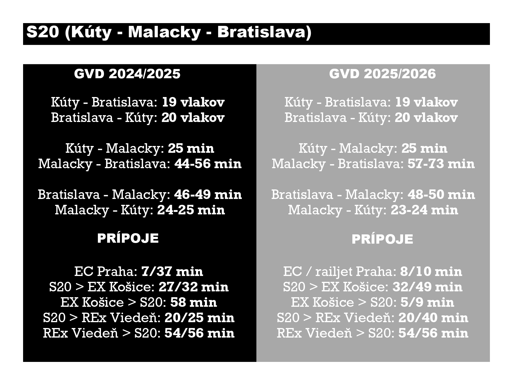 K rapídnemu zhoršeniu príde od 14. decembra na linke S20 z Kútov do Bratislavy, keď sa cestujúcim výraznejšie predĺži cesta. Kým doteraz vlaku z Malaciek do hlavného mesta trvá jazda približne 44 až 46 minút, v novom grafikone to bude 57 až 73 minút.