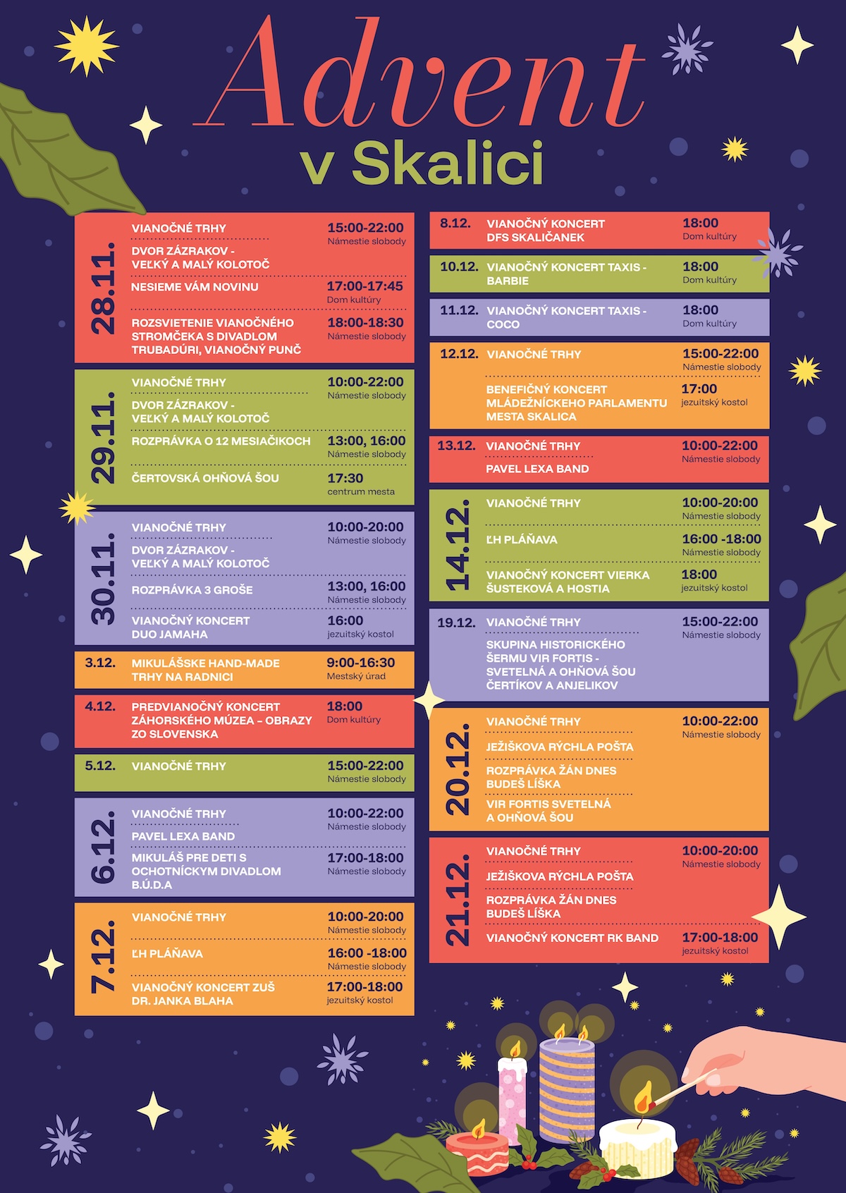 Mesto Skalica pripravilo sériu adventných podujatí, ktoré počas decembra oživia centrum mesta hudbou, remeslami a vianočnou atmosférou. Súčasťou programu budú aj tradičné vianočné trhy, Mikuláš, čertovská šou a koncerty v jezuitskom kostole a Dome kultúry.