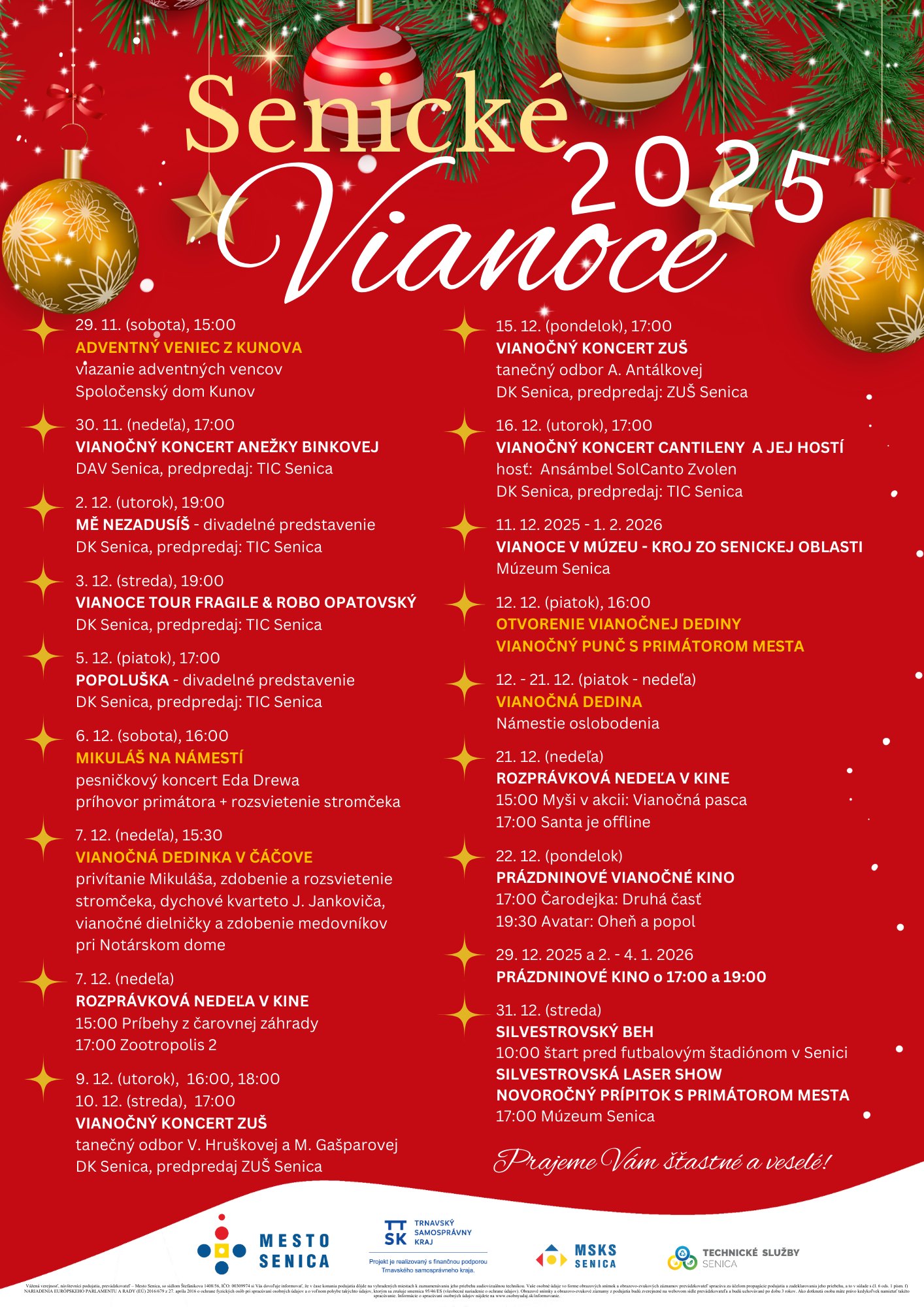 V stredu (3. 12.) sa uskutoční koncert skupiny Fragile a Roba Opatovského. Divadelné predstavenie Popoluška je naplánované na 5. decembra. Mikuláš do Senice zavíta 6. decembra o 16.00 h, keď sa na námestí rozsvieti aj vianočný stromček. Pre deti je pripravený aj pesničkový koncert Eda Drewa.