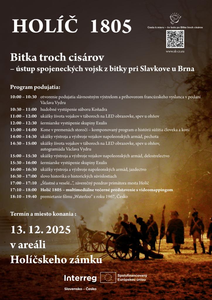Návštevníkov Holíča v okrese Skalica čakajú v sobotu (13. 12.) na miestnom zámku ukážky historickej výstroje a výzbroje, napoleonskí, ruskí a rakúsko-uhorskí vojaci či šermiarske vystúpenia. Vyvrcholením programu bude videomapping Holíč 1805. Stane sa tak pri príležitosti 220. výročia ústupu spojeneckých vojsk z bitky pri Slavkove. TASR to uviedol primátor mesta Zdenko Čambal.