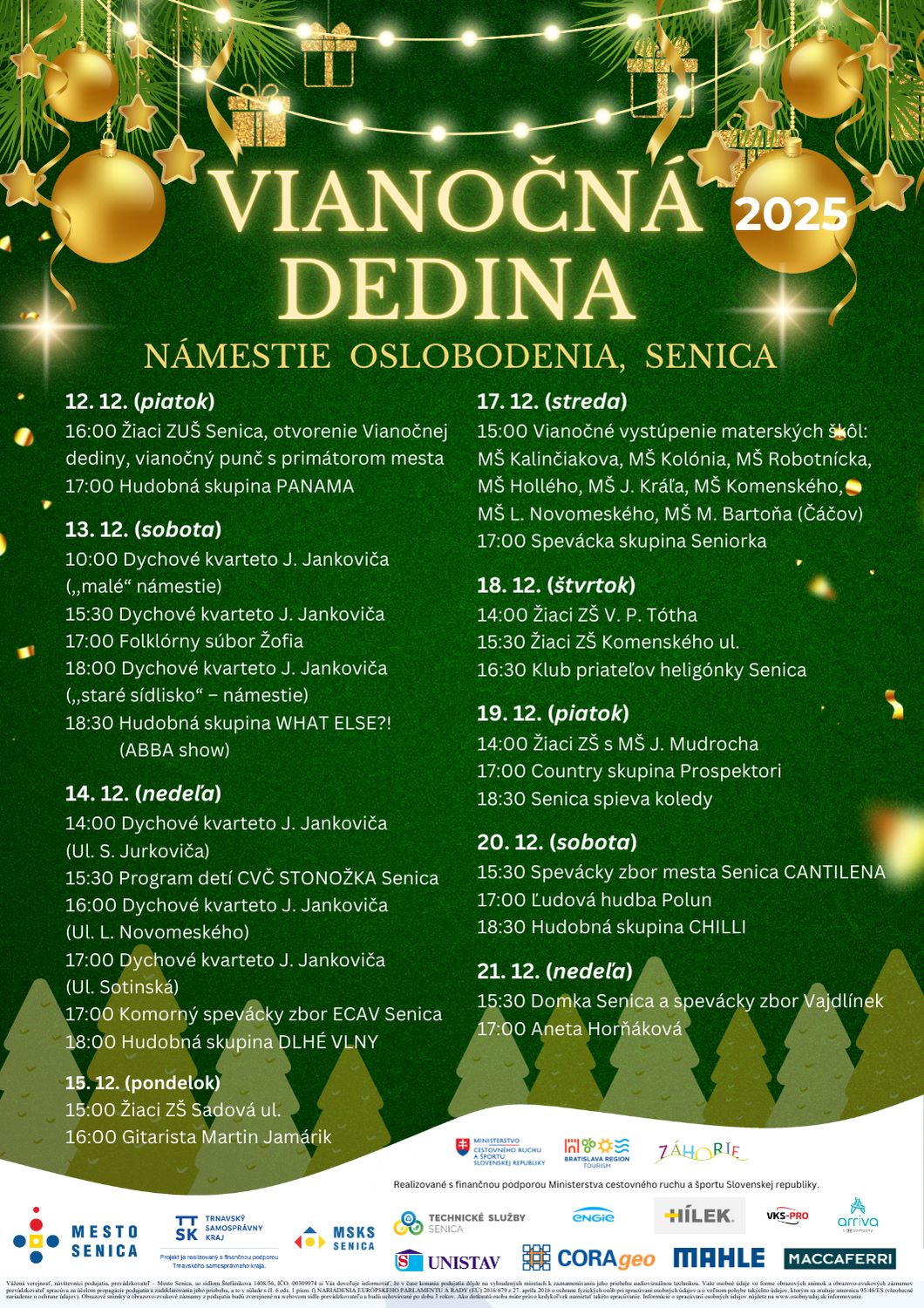 Kultúrno-umelecký program Vianočnej dediny potrvá do 21. decembra, keď ju vystúpeniami na námestí ukončí Združenie saleziánskej mládeže – Domka Senica a spevácky zbor Vajdlínek a Aneta Horňáková.