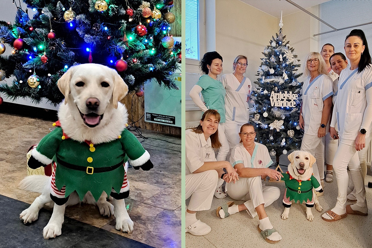 „Vianoce sú časom blízkosti, pokoja a radosti. Ak môžeme aspoň na chvíľu rozveseliť pacientov, ktorí trávia predvianočné obdobie v nemocnici, má to veľký zmysel. Tešiť treba chorých aj zdravých a prečo nie práve s pomocou štvornohého terapeuta,“ hovorí sestra z oddelenia anestéziológie a intenzívnej medicíny Lívia Topolčányová, ktorá sa vo voľnom čase venuje profesionálnej kanisterapii.