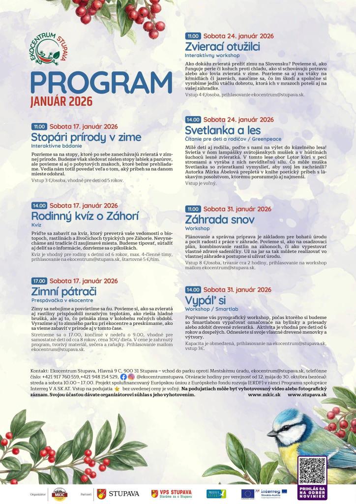 Ekocentrum v Stupave pozýva verejnosť na sériu tematických víkendových podujatí, ktoré prepájajú zábavu, vzdelávanie a kontakt s prírodou. V programe na január 2026 nechýbajú interaktívne dielne, kvízy, čítania ani obľúbená prespávačka.