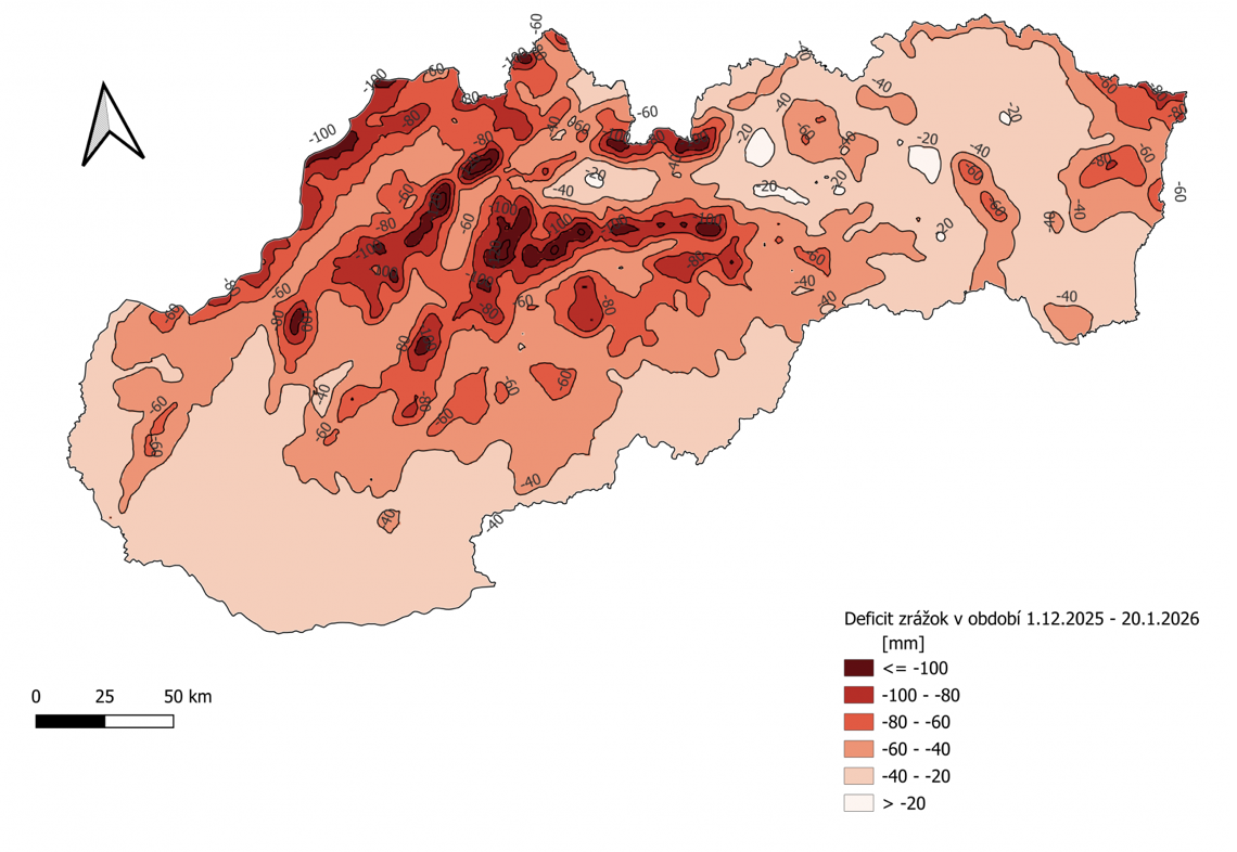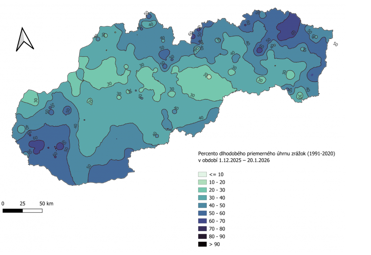 „V absolútnom vyjadrení dosiahli úhrny zrážok na Slovensku v období 1.12. 2025 až 20.1. 2026 iba výnimočne viac ako 60 milimetrov.. Stalo sa to napríklad v Malých Karpatoch,“ hovorí SHMÚ.