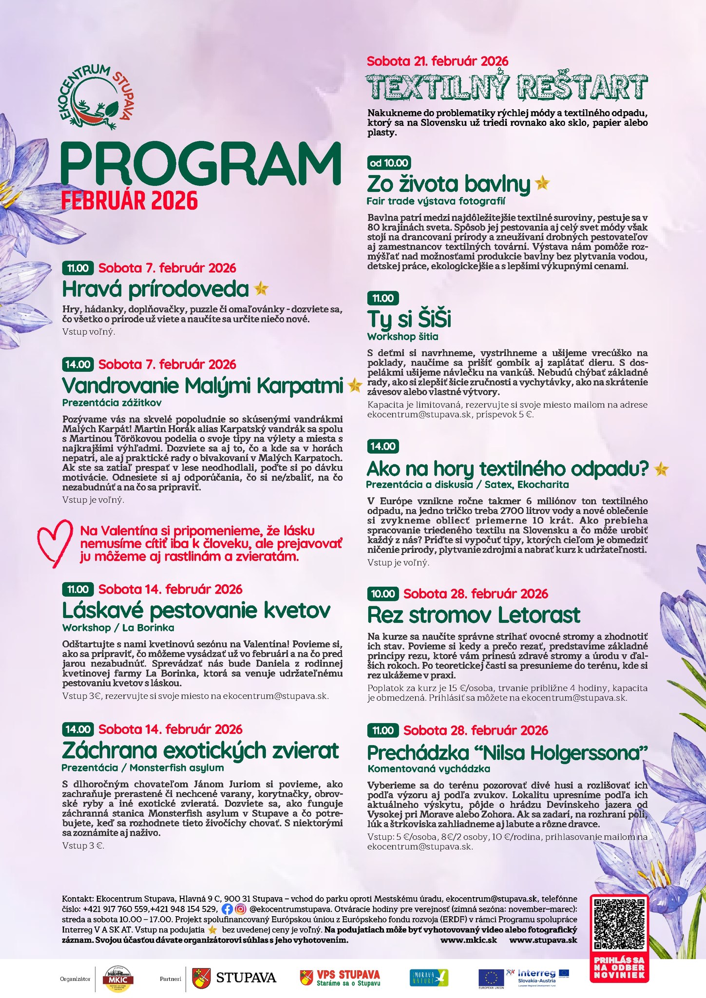 Ekocentrum v Stupave pripravilo aj na február 2026 sériu tematických podujatí, ktoré spájajú vzdelávanie, zážitok a kontakt s prírodou. Návštevníkov čakajú tvorivé dielne, prezentácie, diskusie, workshopy aj terénne vychádzky pre deti i dospelých.