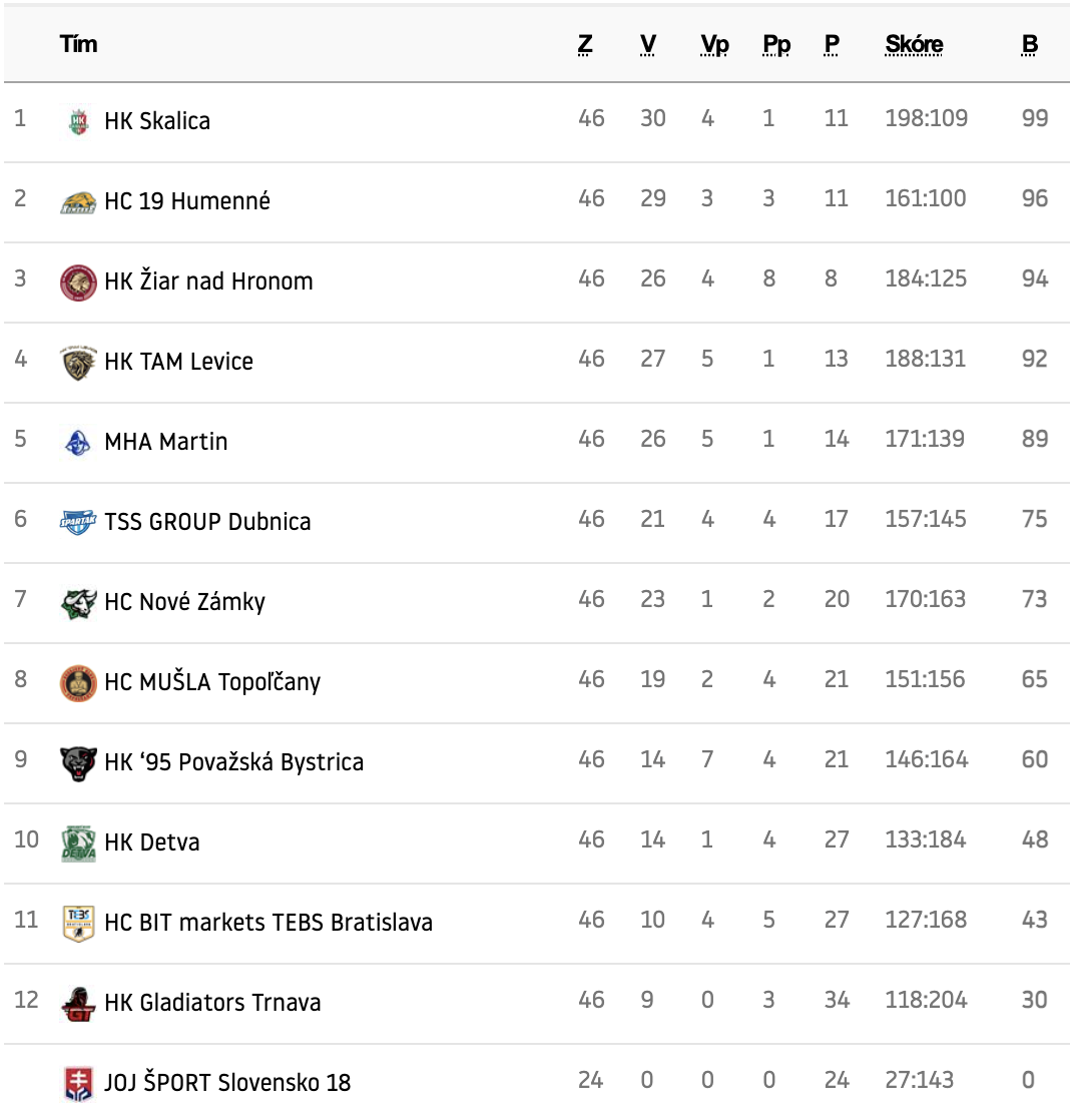 Hokejisti Skalice sa stali víťazmi základnej časti Tipos Slovenskej hokejovej ligy (SHL) v sezóne 2025/2026. V záverečnom kole potvrdili prvé miesto v tabuľke triumfom 8:0 nad Martinom.