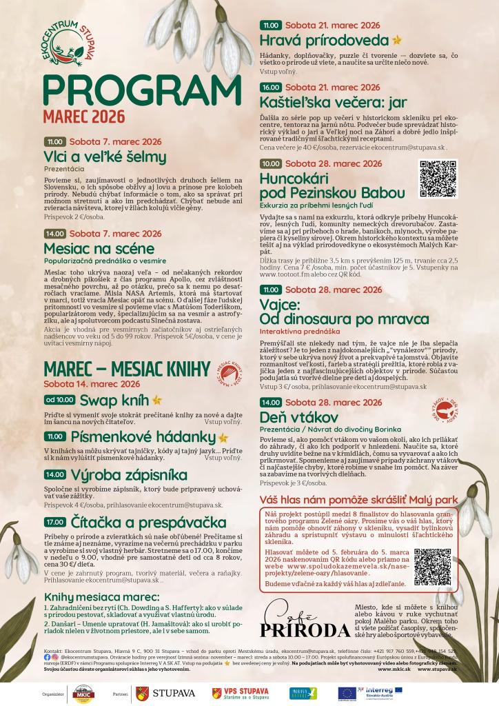 Blížiaca sa jar sa odrazila aj v programe Ekocentra Stupava. V marci pripravilo sériu víkendových podujatí, ktoré spájajú prírodu, tvorivosť, poznávanie aj oddych v Malom parku. Návštevníkov čakajú prednášky, workshopy, knižné aktivity, exkurzia aj program pre rodiny s deťmi.