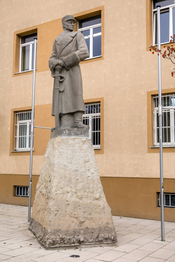 Socha M. R. Štefánika vznikla v roku 1943 v ateliéri akademického sochára Vojtecha Ihriského, ktorý je spoluautorom aj známeho sediaceho Hviezdoslava neďaleko Slovenského národného divadla v Bratislave. Odhalená bola v roku 1944.