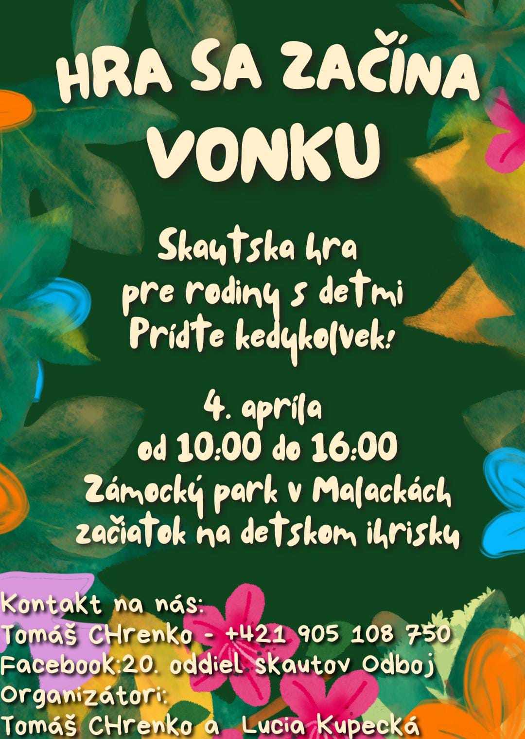 V Malackách sa v sobotu 4. apríla uskutoční otvorené podujatie skautov s názvom Hra začína vonku. Určené je pre deti, rodiny aj všetkých záujemcov, ktorí si chcú vyskúšať hry, výzvy a aktivity inšpirované svetom hier a skautskými zručnosťami.