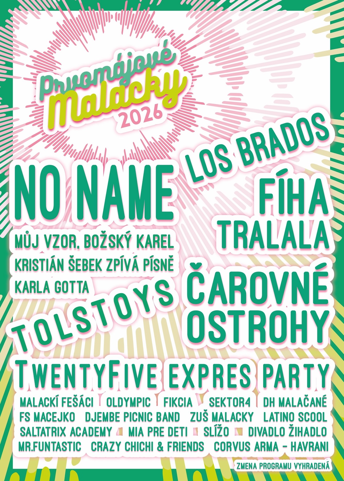 Prvomájové Malacky 2026 sa uskutočnia 1. mája v zámockom parku. Podľa zverejneného programu bude hlavným hudobným hosťom tohtoročného podujatia kapela No Name.